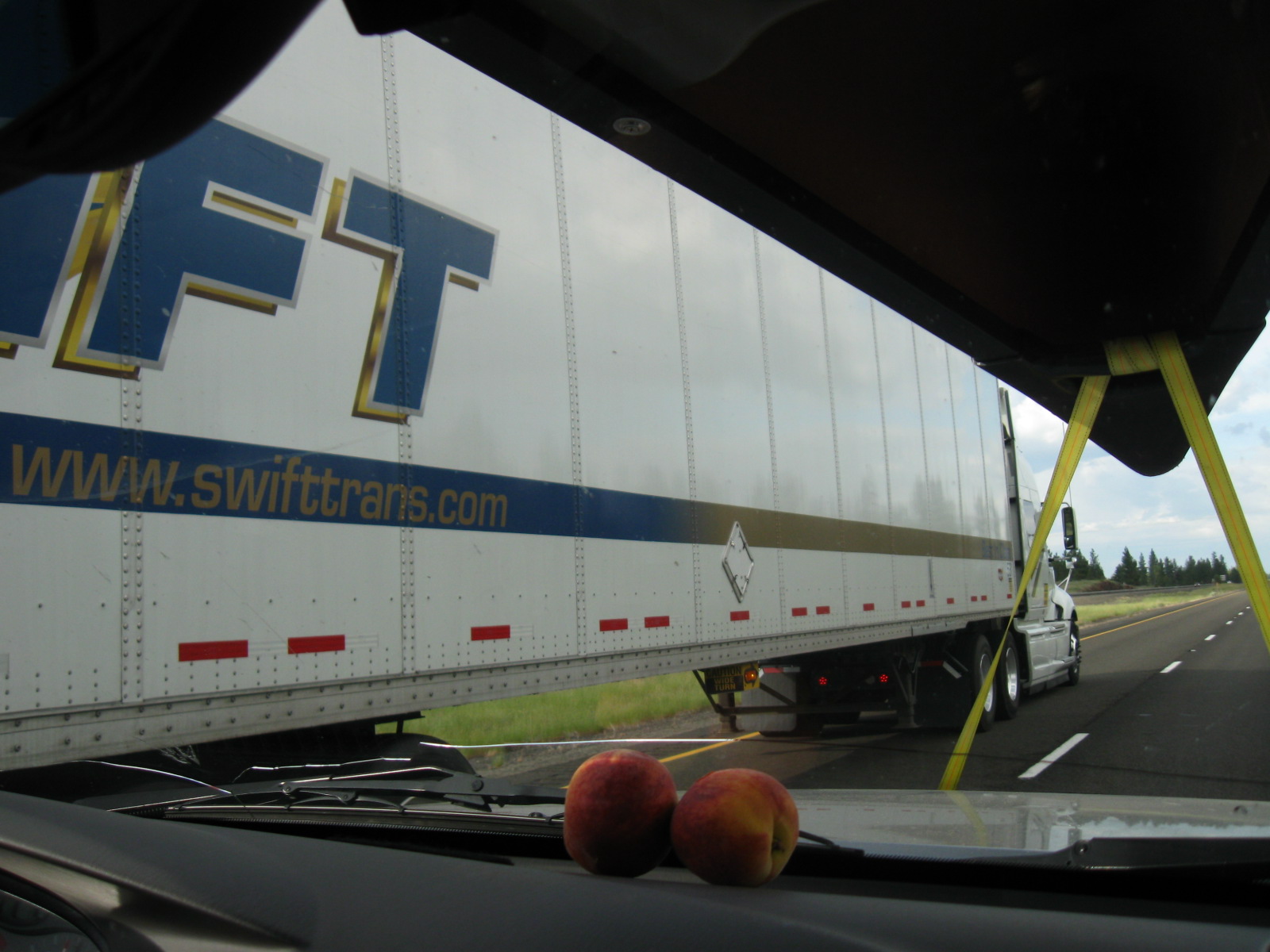 Back to the present, within minutes of departure this morning we were up to cruising speed on hwy I-90 heading eastboound. And mere moments after that we were hearing an unbearably loud howling, rattling noise coming from up top. The culprit was the tie-down straps, which were too loose and were up there flapping like a wizard’s sleeve. After two or three stops to make small adjustments, all of the howling and rattling noises were reduced to a mere mild roar. Problem solved, and so we were soon comfortably back up to speed with hardly a whimper from the big red rocket.